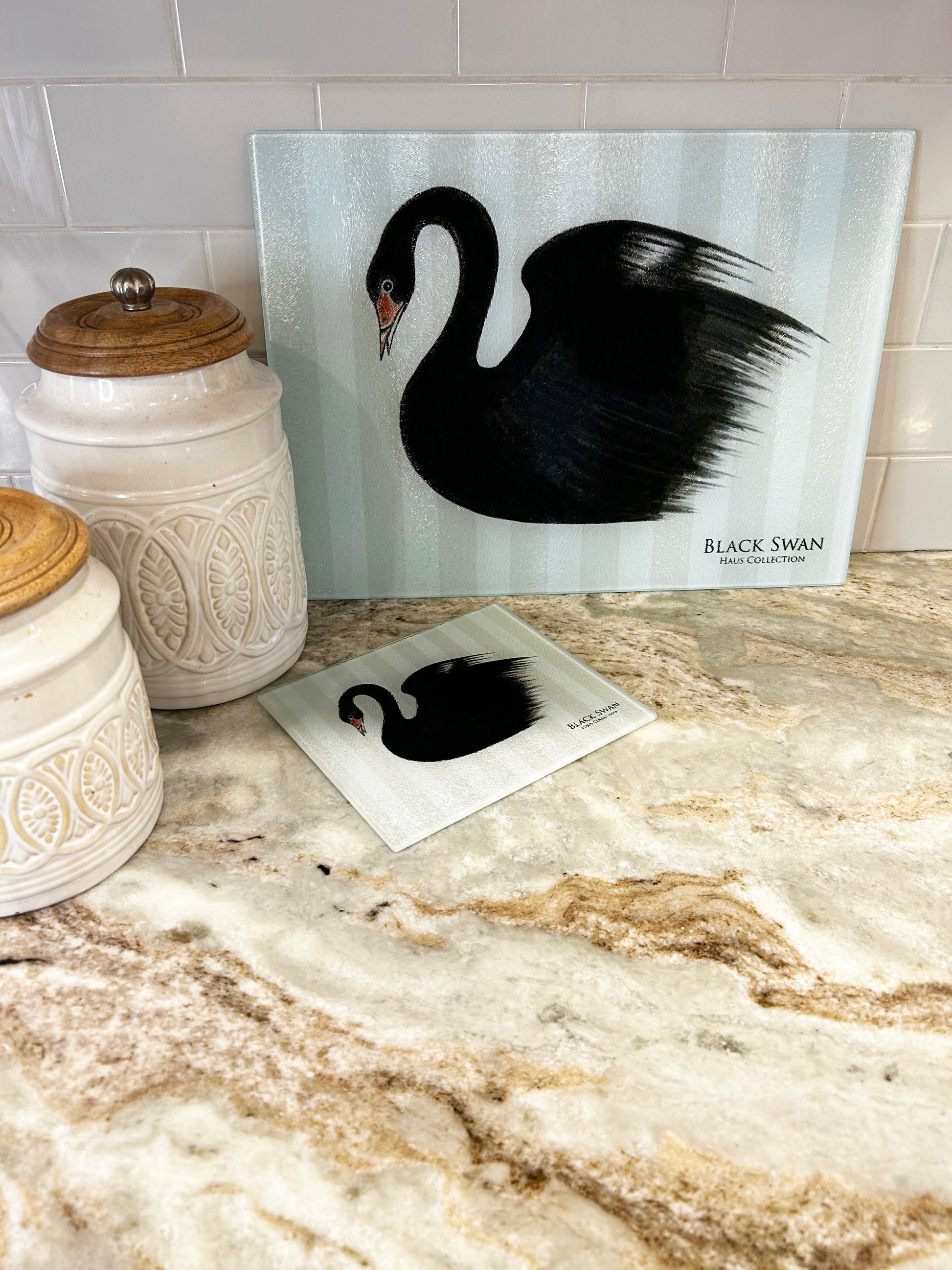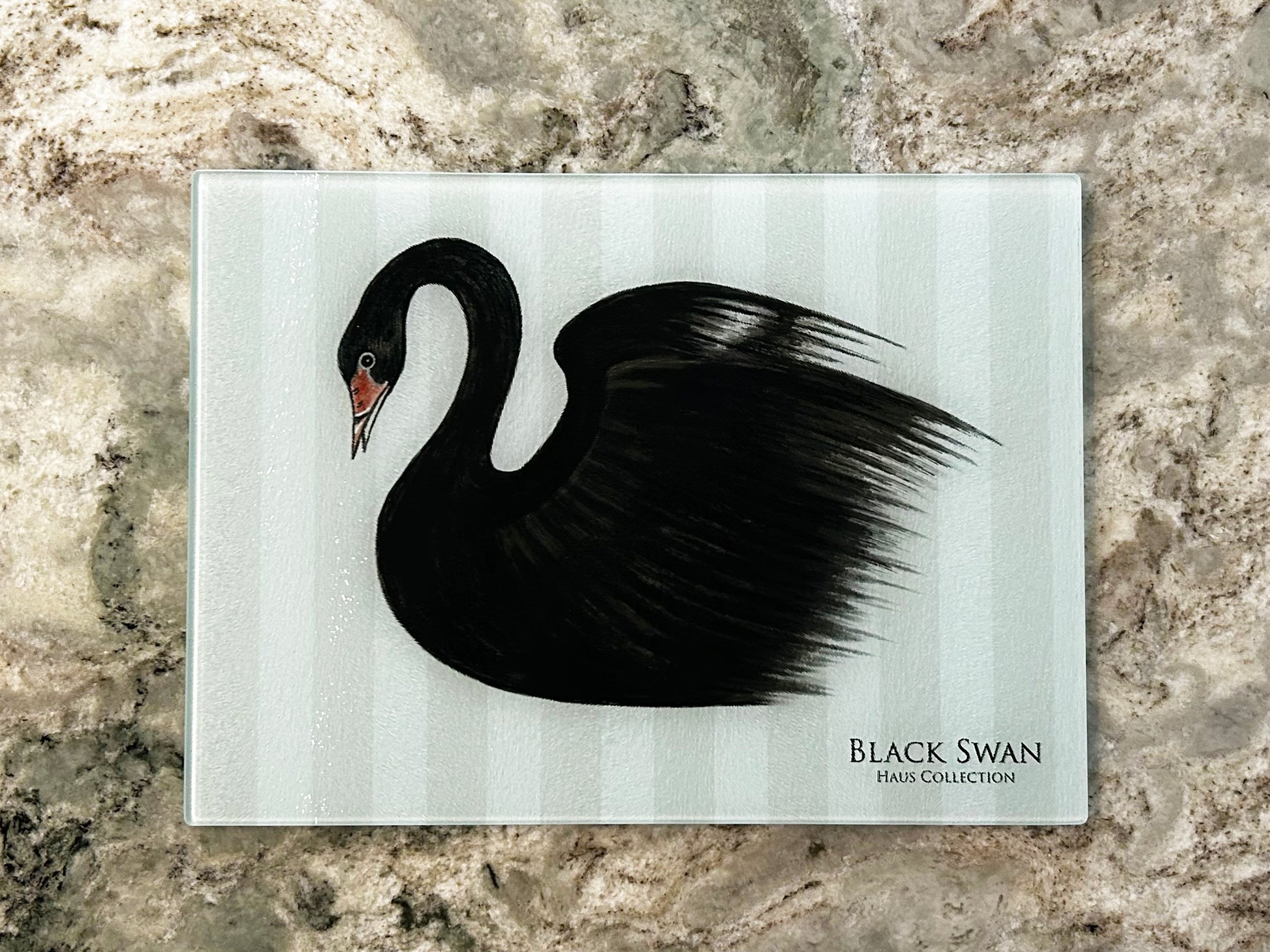 Crafted from durable tempered glass, this board features our iconic Black Swan emblem — a mark of sophistication and quality. Its sleek, minimalist design makes it a standout piece on any bar cart or countertop.